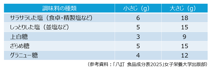 粉状の調味料を計量スプーンで量り取るとき、食塩や精製塩などのサラサラした塩は、小さじ一杯で約6g、しっとりした塩は小さじ一杯で約5gとなります。